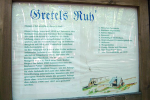 Natürlich gibt es diesen beschaulichen Rastplatz schon sehr lange. Im Zuge des forstlichen Wegebaus mag es sich ergeben haben, dass der Tochter des Oberförsters Meschwitz, die Margarete hieß, dieser Ort am plätschernden Gebirgsbach so git gefiel, dass sie sich ihn bei Spaziergängen als Lieblingsrastplatz auserwählte. Mit der Zeit bürgert sich die Bezeichnung in Forstkreisen und bei der Bevölkerung allgemein ein. Was die "Gretels Ruh" allerdings noch heutzutage so anziehend macht, sind die verschiedenen Anlagen, die von Naturfreunden geschaffen wurden.