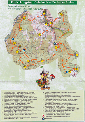 Zu Beginn der Tour finden Sie gleich neben dem Parkplatz in einer gepflegten Anlage die ersten Gedenksteine. Der Weg führt zur Ortsmitte und weiter bis zur Kirche, dabei treffen Sie auf dem Gemeindeplatz auf den Gedenkstein "100 Jahre Völkerschlacht" und neben der Kirche in einer schönen Anlage mit Rastplatz den "Magister George Körner Stein" sowie das steinerne Eingangstor mit Resten der Umfassungsmauer der Bockauer Kirche. Die Wanderung verläuft nun bis zur "Gretels Ruh" und den Kohlweg südwärts. Sehenswert sind hier ein Gedenkstein und Sühnestein, die Johnsäule. Am Franzosenweg gelangen Sie zum Richterdenkmal, eine Stein-Pyramide. Über den Mittleren Buchbergweg (Blick zum Auersberg und Gedenkstein) erreichen Sie den Gläserweg, welcher in Richtung Bockau bis an einen Rastplatz mit Blick zur Talsperre Eibenstock führt. An der Kreuzung nehmen Sie den Weg Lange Sohle talwärts bis zum Bärensäureweg. Nachdem Sie zwei Gedenksteine besichtigt haben, wandern Sie bis der Königsweg abzweigt. Dieser windet sich entlang des Hanges der Zwickauer Mulde talwärts, vorbei an Felsformationen bis zu einer Wegekreuzung. Von dort können Sie bis zur Gaststätte "Rechenhaus" und zum Floßgraben (mit Wanderweg bis Schlema) gelangen. Es ist möglich, den Rückweg über die Muldenbrücke und die Schneeberger Straße in Bockau zu nehmen und Sie kommen direkt zum Parkplatz des Ausgangspunktes. Gehen Sie an der Kreuzung am Königsweg den ansteigenden Amtmannweg, erreichen Sie Bockau im Bereich der mittleren Wohnbebauung (Schulstraße) sowie der Schneeberger Straße (Sparkasse), 100 m vom Parkplatz des Ausgangspunktes.